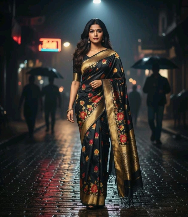 Whether you’re looking to make an unforgettable impression or simply embrace the beauty of traditional Indian wear, the Midnight Rose Banarasi-Style Saree is your ultimate wardrobe essential. Pair it with statement jewelry and a confident smile to complete your look.