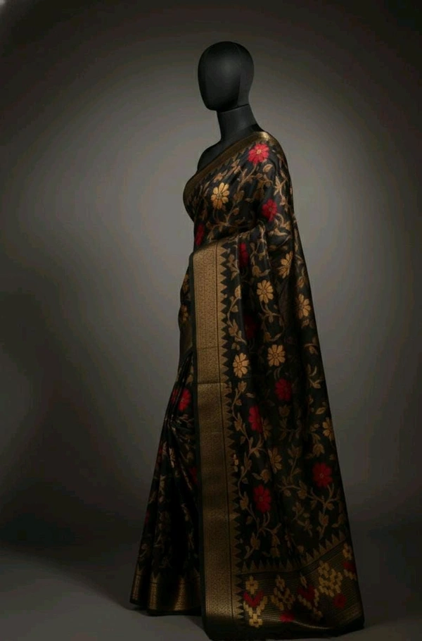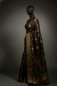 Inspired by the rich heritage of Banarasi craftsmanship, this saree combines intricate artistry with modern sensibilities, ensuring you stand out wherever you go. The deep midnight hue adorned with delicate rose motifs creates a harmonious blend of tradition and contemporary appeal.