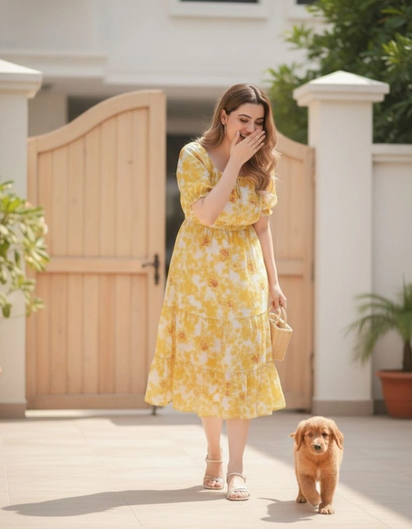 - Eye-Catching Design: Featuring a gorgeous yellow base adorned with delicate floral patterns, this dress radiates cheerful energy and timeless style.